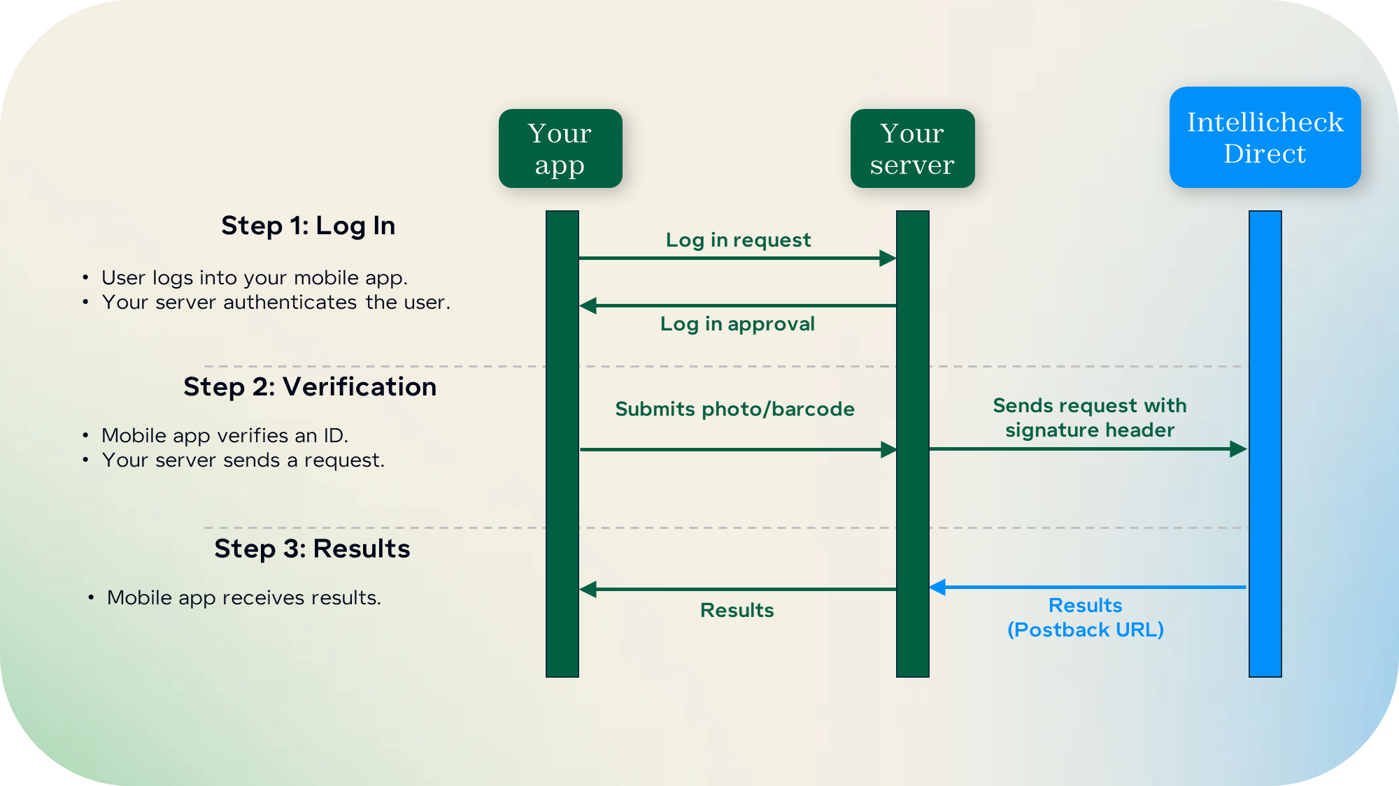 Your mobile app user must first log in before verifying IDs. We make it simple. But the log-in request must go to your server. Our SDK talks to your server. Then your server applies the signature header required for requests. Direct sends a response back to your server.